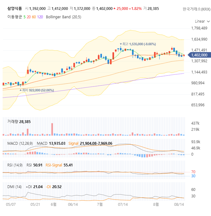 자, 이제 가장 궁금해하실 삼양식품 일봉 차트를 볼 시간입니다. 차트는 우리에게 어떤 이야기를 해주고 있을까요? 현재 주가는 1,402,000원으로, 최근 고점인 1,535,000원에서 소폭 조정받은 상태입니다.