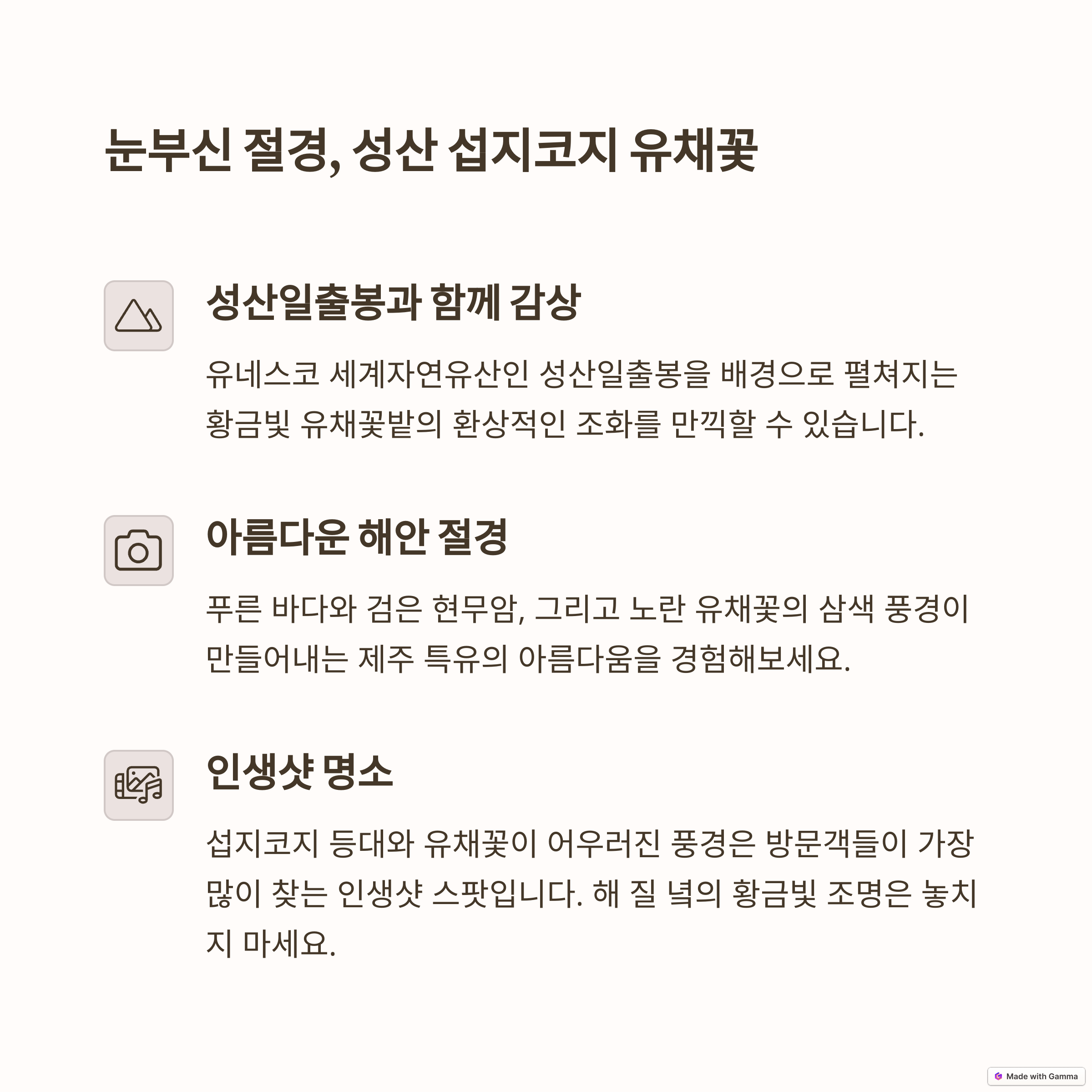 | 2 | 섭지코지 | 유채꽃 + 바다 |